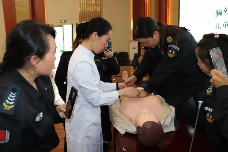 首先由新舟鎮(zhèn)衛(wèi)生院護(hù)士長一行人員為參訓(xùn)保安員講解急救要領(lǐng),現(xiàn)場演示徒手心肺復(fù)蘇操作技巧,并要求每位保安員實操練習(xí)。